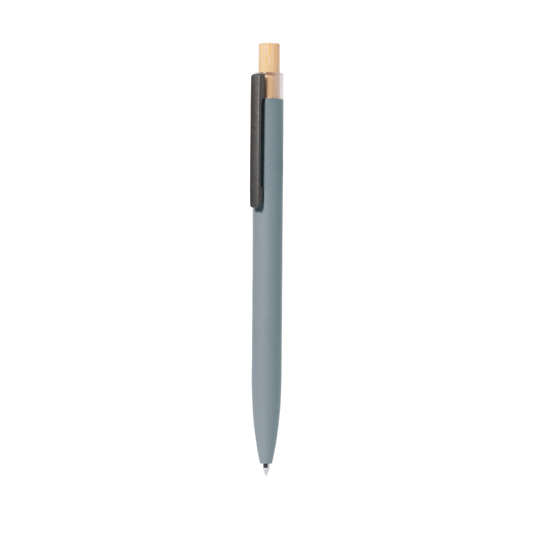 Bolígrafo de mecanismo pulsador fabricado en aluminio reciclado. Pulsador en bambú y cuerpo acabado goma, disponible en variada gama de elegantes colores. Clip metálico y distintivo aluminio reciclado en la parte superior del bolígrafo. De cartucho jumbo y en tinta azul. Presentado en bolsa individual reciclada.El aluminio reciclado es un material con posibilidades de reciclaje casi infinitas, sin perder sus propiedades originales y consumiendo menos energía en este proceso.Certificación GRS (Global Recycled Standard / Estándar de Reciclaje Global), que garantiza el origen reciclado del material usado para fabricar el producto. Bambú/ Aluminio Reciclado. Acabado Caucho
