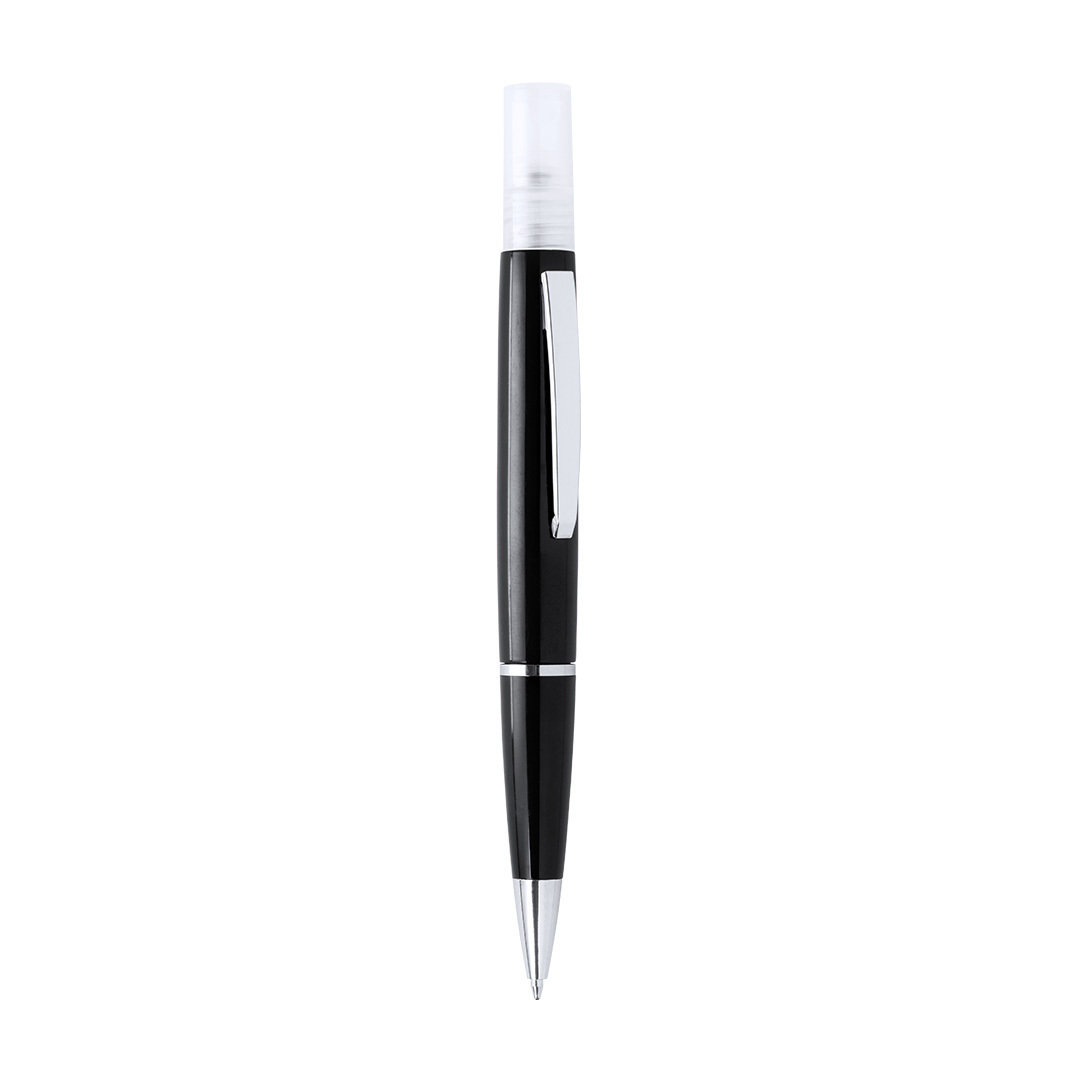 Bolígrafo higienizante con pulverizador recargable integrado y capucha protectora. Acabado en resistente ABS brillante con elegante clip metálico y cómoda empuñadura y escritura en tinta azul. Capacidad del pulverizador 3ml. Líquido no incluido. Disponible en amplia y variada gama de colores.