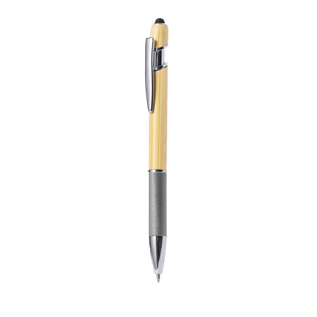 Bolígrafo puntero con cuerpo en bambú y papel reciclado. Caña fabricada en suave bambú con empuñadura hecha en cartón reciclado con textura y en variados colores. En la parte superior tiene un puntero negro. Clip metálico y accesorios en cromado. De mecanismo pulsador y en tinta azul.Elaborado con elementos vegetales para así fomentar la utilización de materias primas naturales y reducir las emisiones contaminantes. Bambú/ Papel