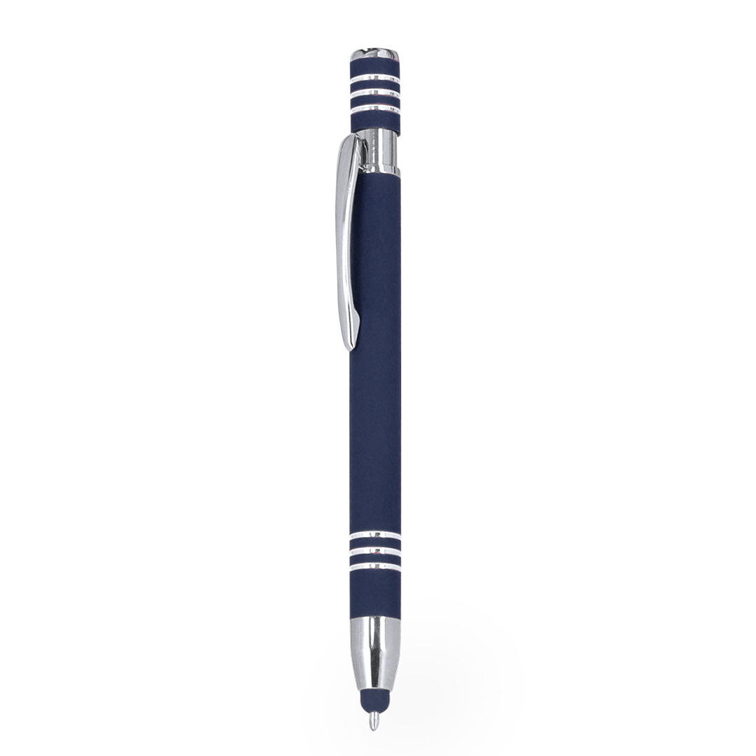 Bolígrafo puntero con mecanismo pulsador, fabricado en aluminio. Cuerpo con acabado de caucho, efecto gomoso. Especialmente diseñado para el marcaje a láser, revelando el logotipo en tono plateado. Incluye accesorios cromados y clip a juego. Tinta azul. Aluminio. Acabado Caucho