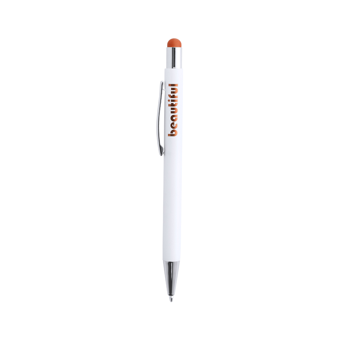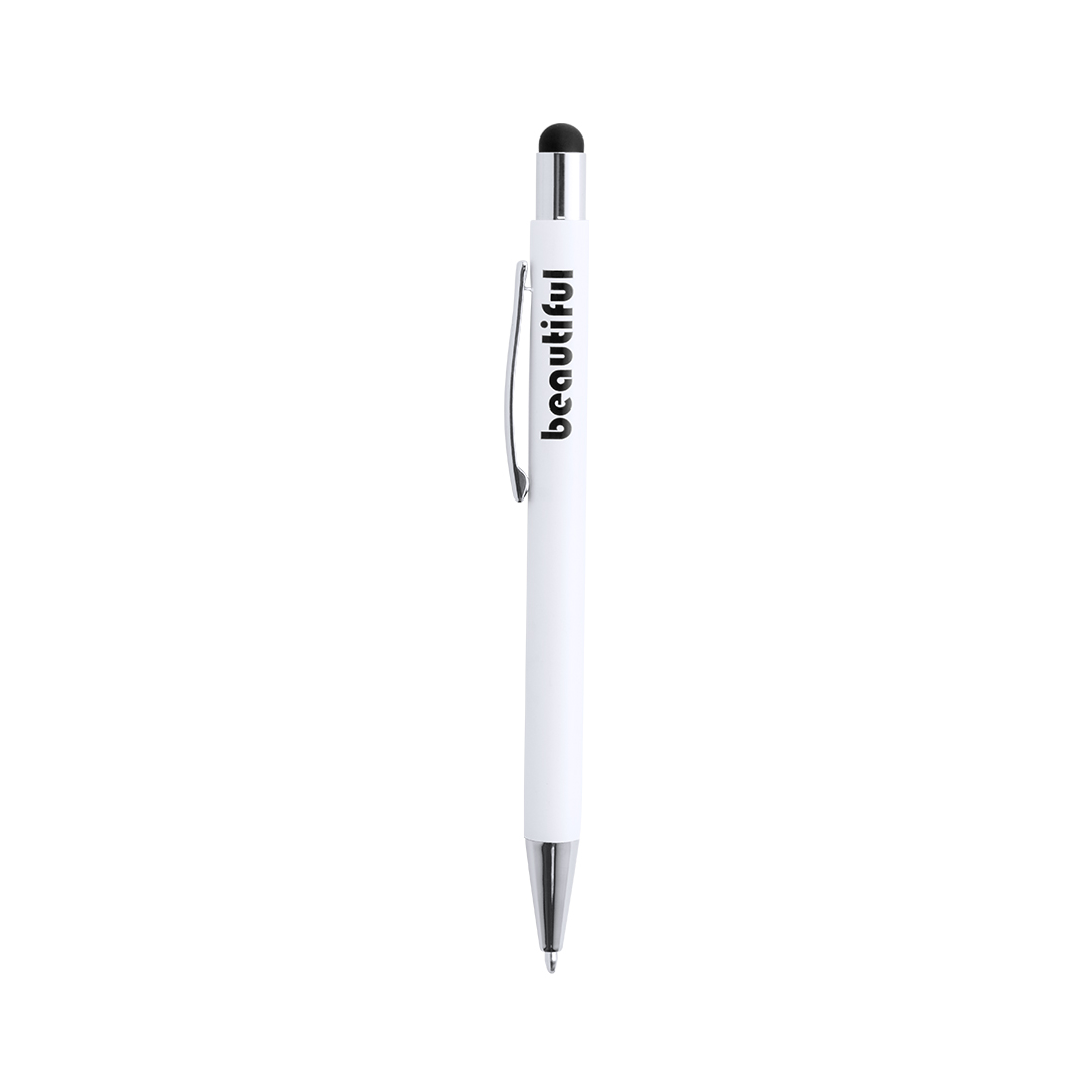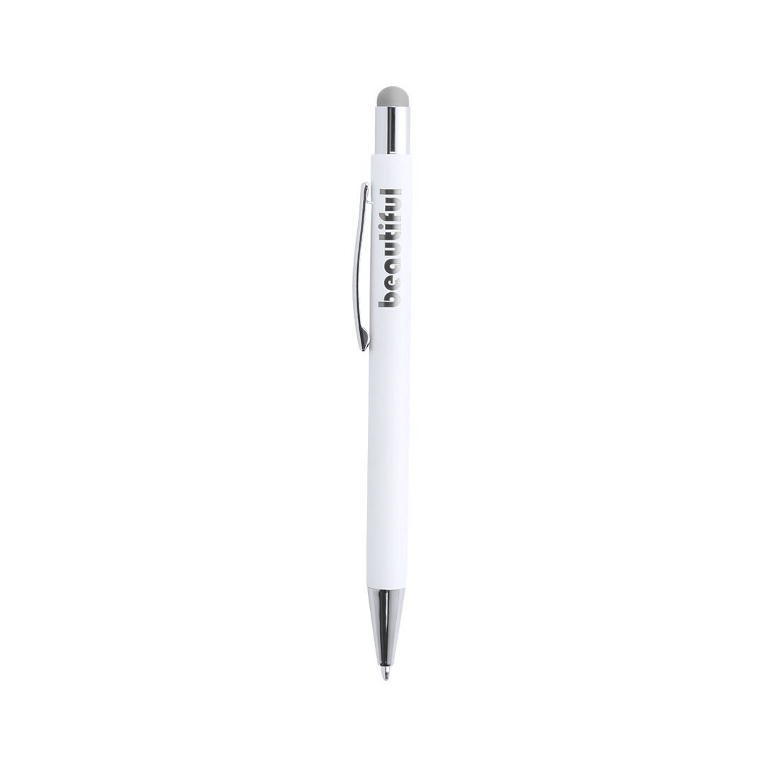 Bolígrafo puntero de mecanismo pulsador con cuerpo de aluminio en elegante color blanco mate. Puntero en variada gama de colores, a juego con el color del interior y con detalles cromados. Recubrimiento exterior especialmente diseñado para marcaje en láser, con el que conseguirá que su publicidad o marca quede perfectamente grabada en color a juego con el del interior. Con cartucho jumbo y tinta azul. Aluminio. Acabado Caucho