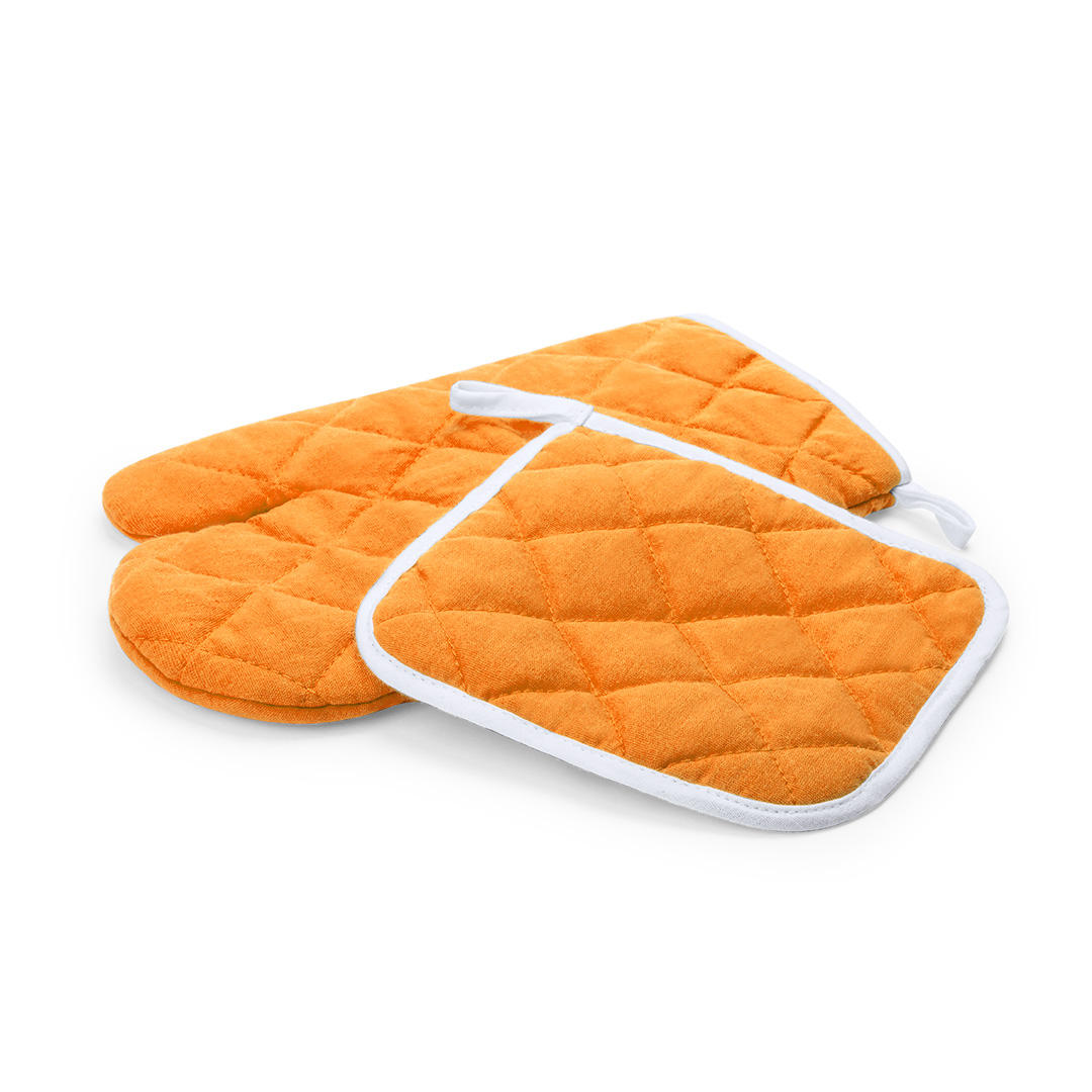 Set de cocina con agarrador y manopla en material TC -combinado de algodón y poliéster-. En variada gama en vivos colores con interior en blanco. Una cara lisa especialmente diseñada para impresión y cinta para colgar. TC. Algodón/ Poliéster
