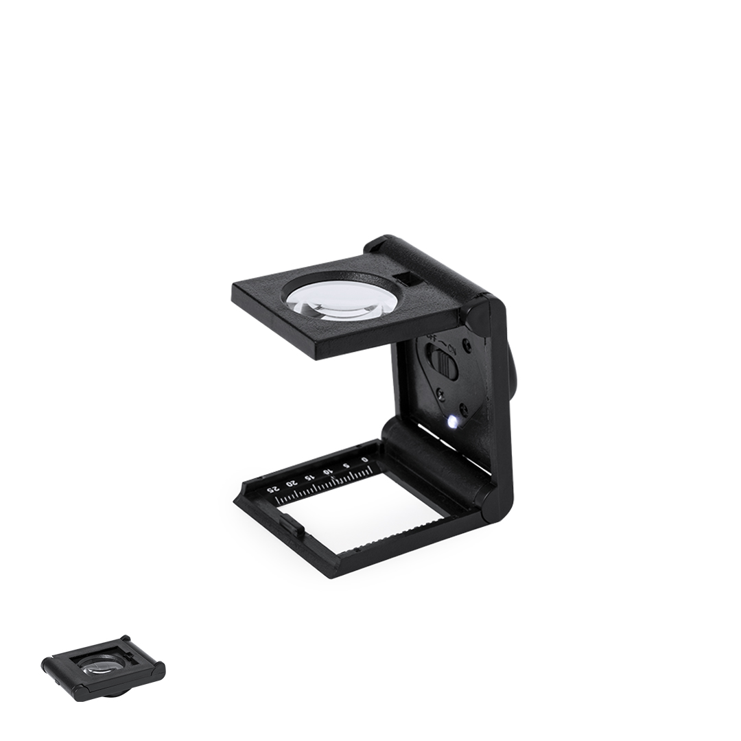 Lupa plegable de 8 aumentos fabricada en resistente PP, con luz LED integrada y regla de medición, Alimentada con pila de botón (incluida) y presentada en caja individual negra de cartón negro.