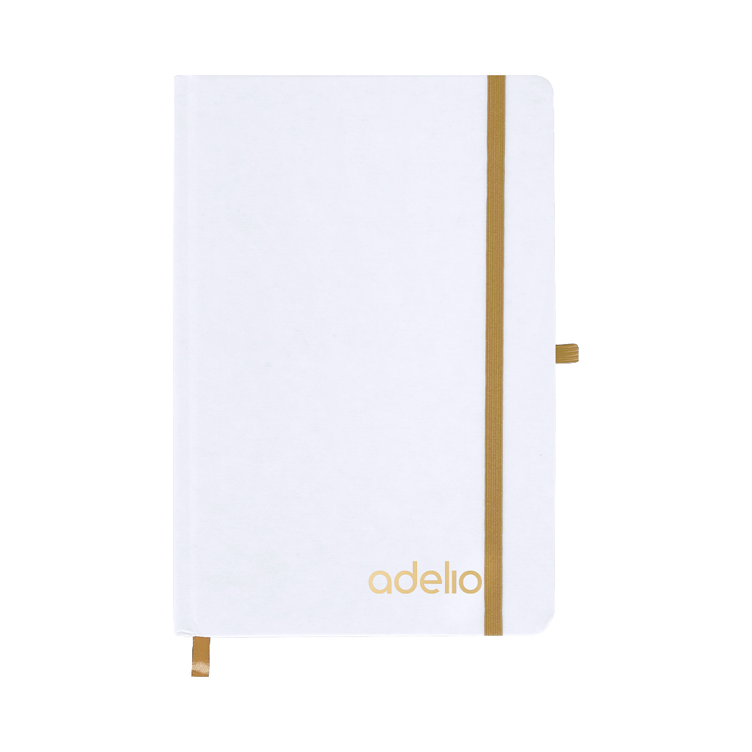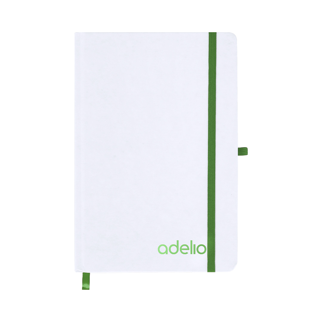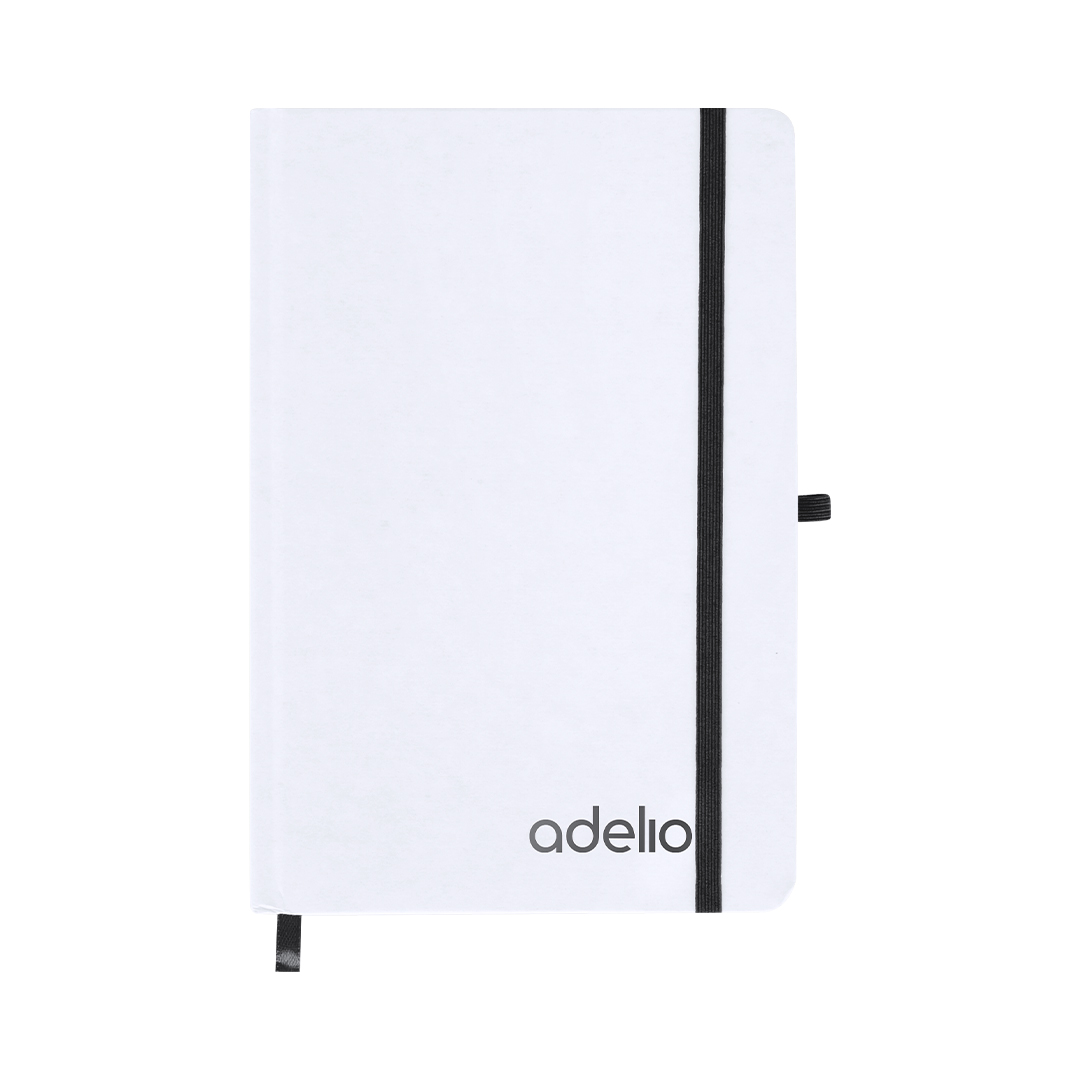 Bloc de notas con tapas rígidas blancas fabricadas en Cartón Reciclado. Interior con 80 hojas a disposición de una raya. Incluye marcapáginas, en mismo color que cinta elástica de cierre y portabolígrafos. Especial para grabado láser mostrando el color seleccionado. Cartón Reciclado