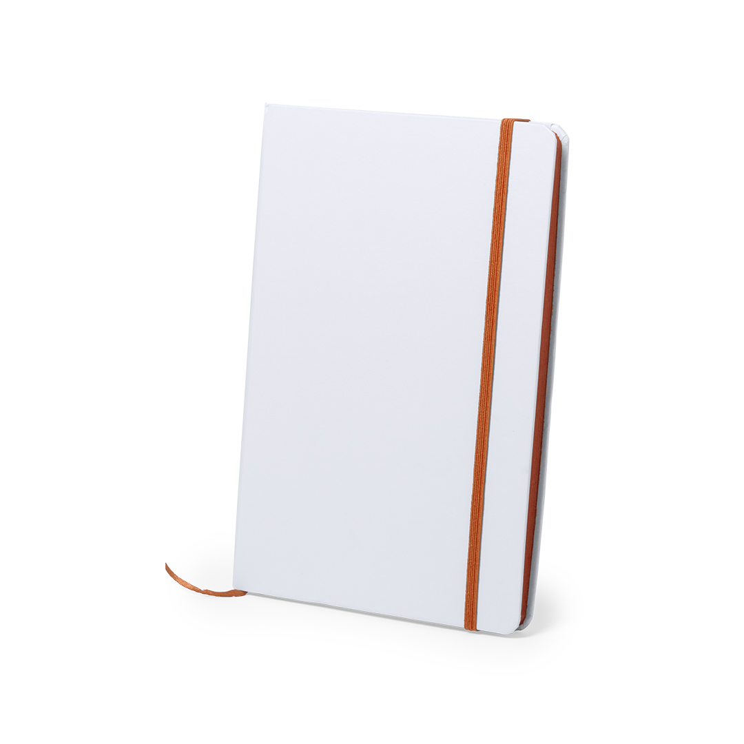 Bloc de notas con tapas rígidas de suave tacto acabadas en color blanco. De 100 hojas lisas con lomo en divertidos colores, elástico de sujeción y marcapáginas de tela a juego. Cartón