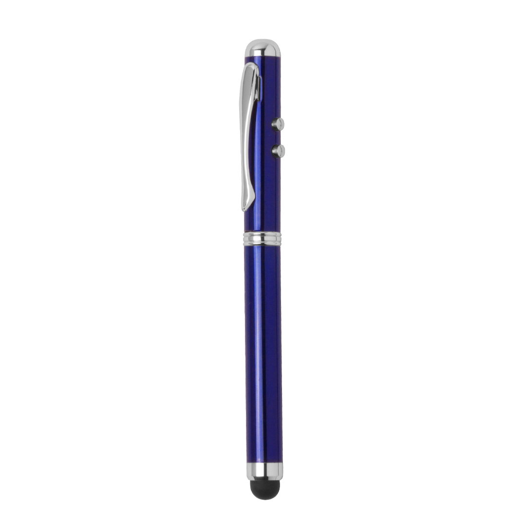 Bolígrafo láser metálico en elegante acabado brillo, con pulsadores de activación laterales para funciones láser y linterna (pilas de botón incluidas). En tinta azul, con puntero táctil integrado, cierre de capucha y clip cromado. Especialmente diseñado para marcaje en láser. Presentado en un elegante estuche metálico en caja individual de cartón de acabado plateado. Interior en suave esponja troquelada, con pilas de recambio. Metal