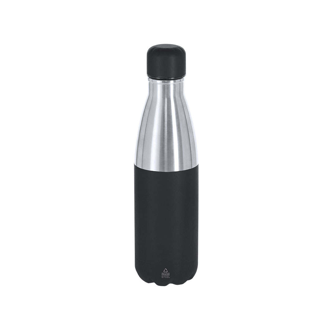 Bidón térmico de 550 ml de capacidad, fabricado en acero inox reciclado de doble pared. Su diseño combina cuerpo en acabado silver con tapón a rosca y base en color mate a juego. Libre de BPA. Incluye distintivo de acero inox reciclado.El acero es uno de los materiales más demandados y que puede encontrarse casi en todas partes, desde productos de uso diario a grandes construcciones. Con innumerables propiedades, entre las que cabe destacar la durabilidad y su alto grado de reutilización, convirtiéndolo en una alternativa muy valorada en soluciones de sostenibilidad. Debidamente tratado, permite obtener nuevos recursos de infinita utilización. Acero Inox Reciclado