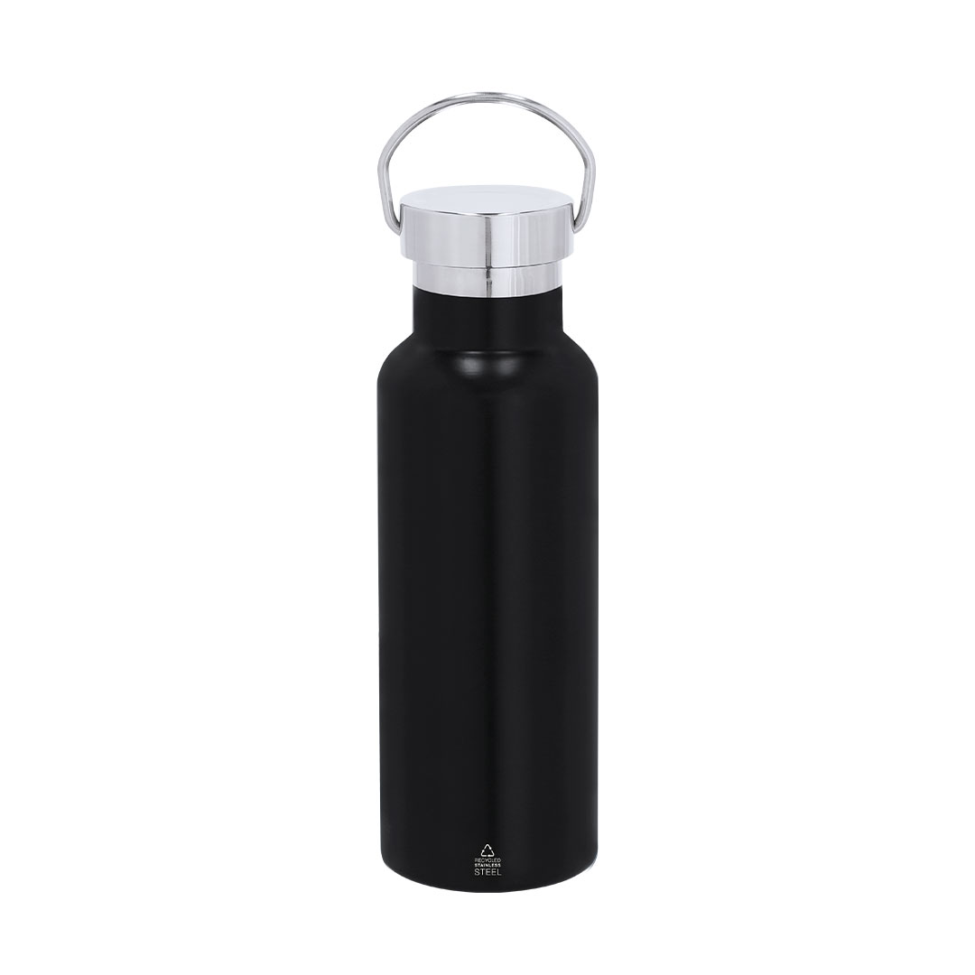 Bidón termo en Acero Inox Reciclado de 500 ml de capacidad. Con doble pared para mejor y más duradera conservación de la temperatura e interior con recubrimiento de cerámica, apto para bebidas carbonatadas. Tapón a rosca con sólida asa de trasporte en acero pulido. Con distintivo de Acero Inox Reciclado.El acero es uno de los materiales más demandados y que puede encontrarse casi en todas partes, desde productos de uso diario a grandes construcciones. Con innumerables propiedades, entre las que cabe destacar la durabilidad y su alto grado de reutilización, convirtiéndolo en una alternativa muy valorada en soluciones de sostenibilidad. Debidamente tratado, permite obtener nuevos recursos de infinita utilización. Acero Inox Reciclado/ Interior cerámico