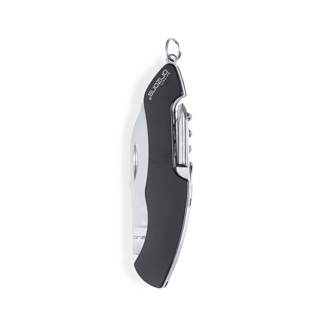 Navaja multiusos de orizons con accesorios de acero inox de 10 funciones y mango de aluminio en vivos colores. Con navaja, tijeras, abrelatas, abrebotellas con destornillador plano, destornillador de punta de estrella, punzón con lima y sacacorchos. Con anilla para llavero y presentada en atractiva caja de diseño con logotipo de la marca. Aluminio/ Acero Inox