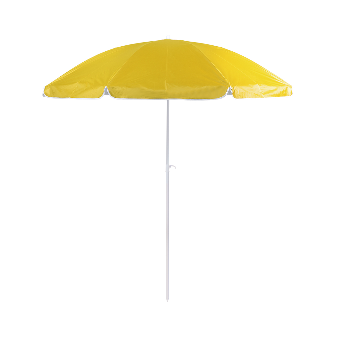 Sombrilla de playa de 8 paneles en resistente nylon. Interior en color gris plateado con protección UV, con tubo telescópico inclinable y ajustable en altura. 200cm de diámetro, con faldones laterales ribeteados, tubos metalizados en color blanco y disponible en una amplia gama de colores. Presentada en funda de nylon con cinta de transporte para hombro. Nylon