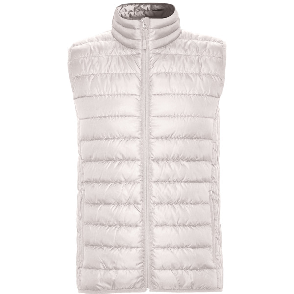 Chaleco acolchado resistente al agua. Cremallera frontal invertida al tono con protector de barbilla del mismo tejido. Bolsillos laterales con cremalleras invertidas al tono insertado en los paneles laterales. Vivo elástico al tono en sisas y bajo. Opción de colores lisos o a contraste en interior. Exterior: 100% poliéster, 300T.Forro: 100% poliéster.Guata: 100% poliéster, efecto pluma.290 g/m².