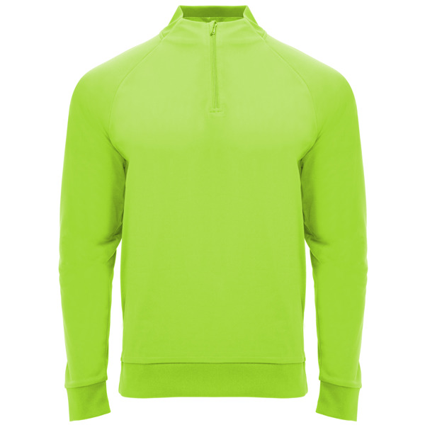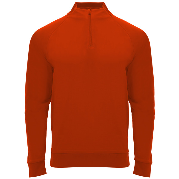 Sudadera de manga ranglán, con Interior perchado, cuello con media cremallera y cubrecosturas de refuerzo en su interior a tono. Parte posterior del cuello, puños y bajo en canalé 1×1. 100% poliéster, 200 g/m².