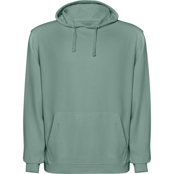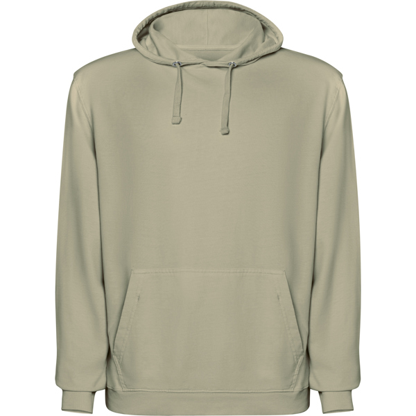 Sudadera unisex de algodón efecto lavado no perchado, con capucha. Bolsillo canguro. Puños y cinturilla en canalé 2×1 con elastano. Cordón plano al tono con ojales metálicos. Cubrecosturas del mismo tejido. 100% algodón, 250 g/m².