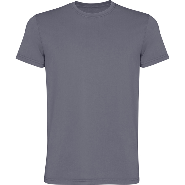 Camiseta man de manga corta en algodón peinado efecto lavado. Cuello redondo en canalé 1×1. Cubrecosturas en cuello del mismo tejido. Costuras dobles en laterales y sisas. 100% algodón, 180 g/m².