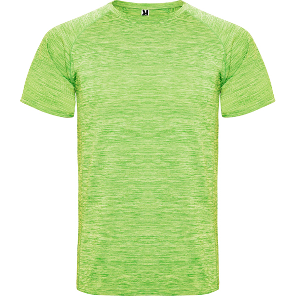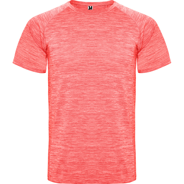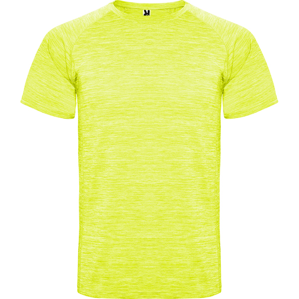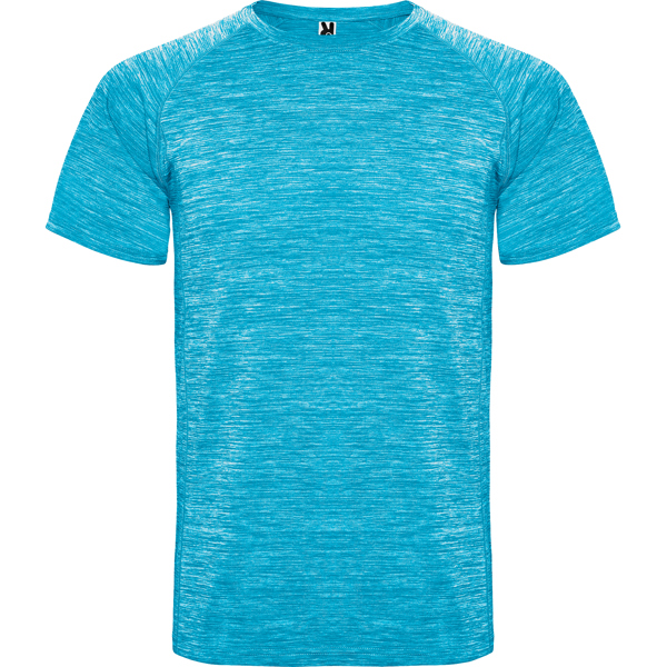 Camiseta técnica manga ranglán transpirable. Paneles laterales con costuras antirroce. Cuello redondo y cubrecosturas del mismo tejido al tono. 100% poliéster space dye, 140 g/m².