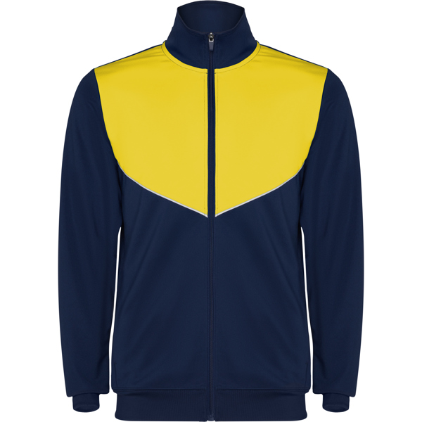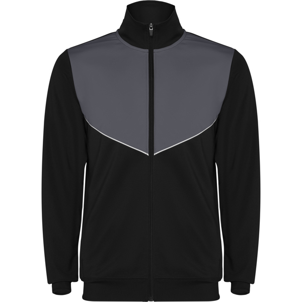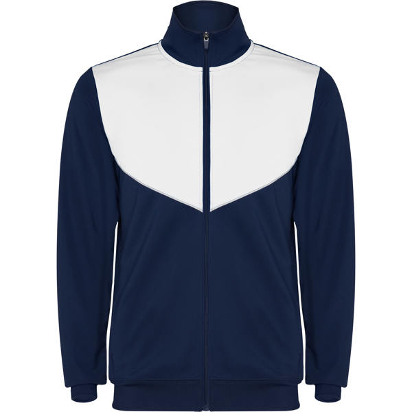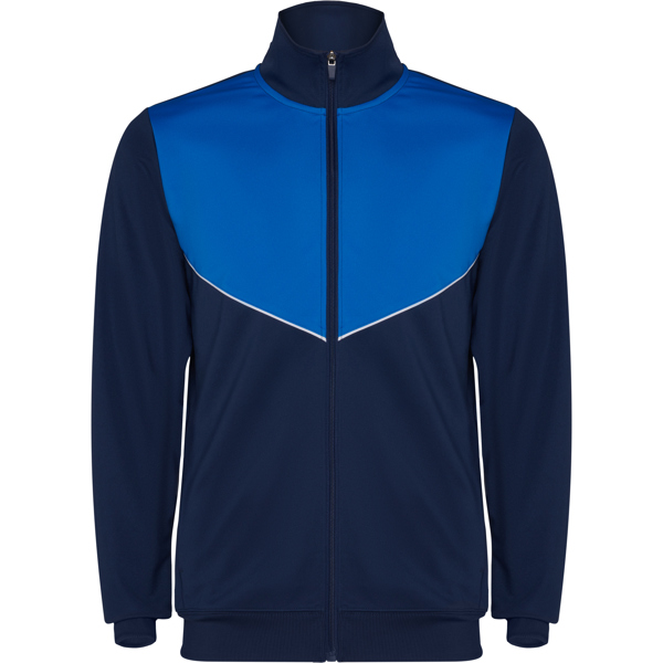 Chándal tejido ligero no perchado. Chaqueta de cuello alto y cubrecosturas a contraste. Piezas a contraste de color en pecho y vivo. Cremallera frontal. Bolsillos laterales con cremallera. Cuello, puños y cintura en canalé de 2×2. Pantalón corte pitillo con cintura elástica y cordón ajustable. Pieza lateral a contraste de color y cremalleras en los tobillos con tapeta. 100% poliéster interlock, 225 g/m².