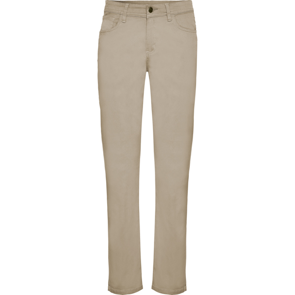 Pantalón largo mujer.· Tejido stretch.· Cierre con cremallera y botón metálico personalizado.· Trabillas en la cintura para cinturón.· Bolsillos frontales a la cadera.· Dos bolsillos traseros de ojal con botón. 97% algodón / 3% elastano, 280 g/m².